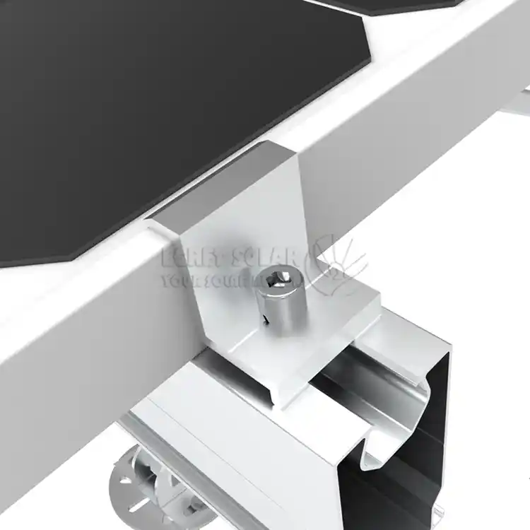 zacisk końcowy solarnymocuje ramę najbardziej zewnętrznego elementu każdego rzędu do końca szyny, aby zapobiec jej zsuwaniu się. Jednocześnie dociśnięcie krawędzi elementów pomaga ograniczyć wnikanie wiatru, deszczu i kurzu z boków. Znajduje się na krawędzi układu i bezpośrednio przenosi największą siłę nośną wiatru (siła ciągnącą w górę) i siłę ssania wiatru. Jest to kluczowy punkt przenoszący siłę w konstrukcji wiatroodpornej i musi mieć wystarczającą wytrzymałość mechaniczną.