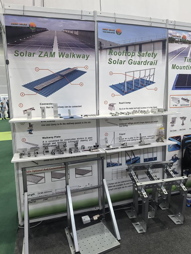 Na wystawie zaprezentowaliśmy kilka akcesoriów dachowych, m.in. zaciski, haki i nóżki w kształcie litery L. Klienci mogą wybierać różne kombinacje w zależności od środowiska instalacji. W przypadku dachówek stalowych malowanych kolorowo stosuje się zaciski lub nóżki w kształcie litery L, natomiast w przypadku dachówek ceramicznych hak dachowy solarny. Możemy również dostosować zaciski w oparciu o model płytki stalowej powlekanej kolorowo lub wydłużyć ramię haka, aby dostosować je do zastosowań na miejscu.